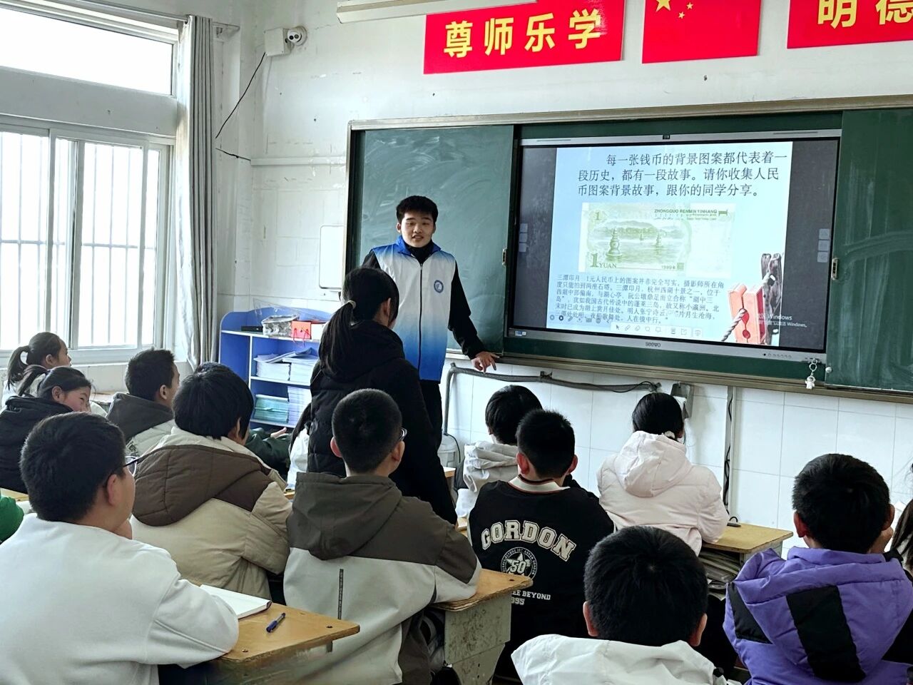 活动筹备阶段,团队成员系统梳理货币发展史料,精心设计教学方案,制作贝币、刀币等仿古钱币模型,确保知识传播的专业性与趣味性。在此基础上,邱浩杰以时间轴为脉络,从商周贝币、秦半两钱到北宋交子,再现中国古代货币体系演进历程;在“世界货币巡礼”专题中,他重点解析欧元区统一货币战略、日元文化符号等世界货币知识,解析各国货币设计背后的经济与美学逻辑,带领小学生感受世界货币的魅力。