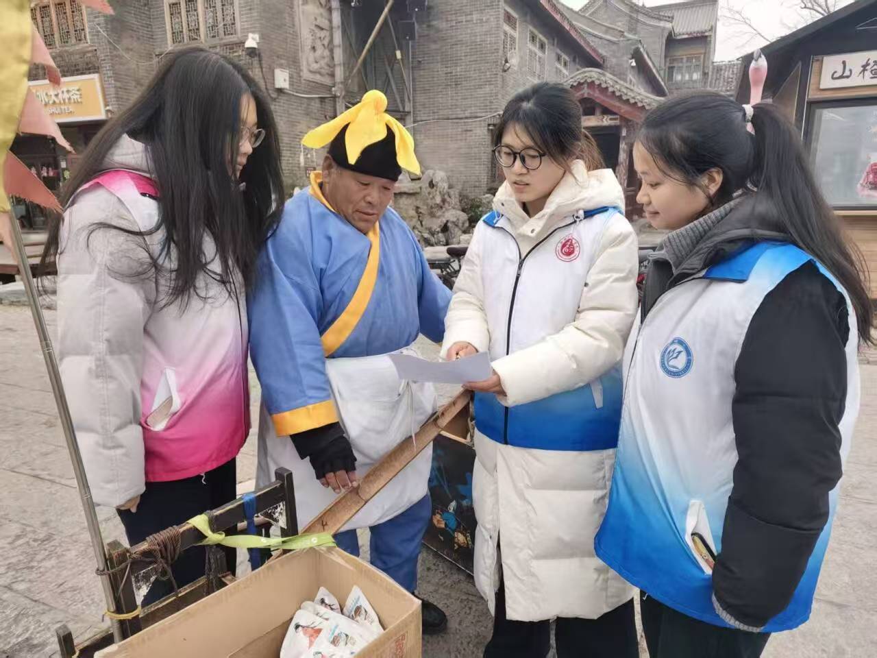 在光岳楼管理员的专业引导下,实践队员们用影像记录建筑细节,结合系统讲解,深入理解了光岳楼作为运河航运枢纽的战略地位与文化价值;在赴山陕会馆,实践队员梳理其商贸枢纽与同乡纽带的双重功能,对“三雕”工艺进行专业记录;在东昌湖古码头调研环节中,团队成员与当地商贩、居民深度访谈,针对多方面展开问卷调研,结合实际分析得出运河文化活态传承需扎根本土生活,融合群众需求与文旅发展,让文化符号融入日常经营与民俗活动,借住青年力量发挥创意与专业优势,助力运河文化的年轻化传播与场景化活化等有效结论。