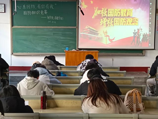 家事国事天下事,事事关心。活动伊始,主持人分享了一段视频,该视频讲述了无论是现役、退役军人,还是平民百姓,在“威逼利诱”的情况下,仍然以一颗心系国防的赤子之心,坚决守卫国家安全的故事。一段段激动人心的画面,让同学们的眼神中迸射出一道道光芒,热血沸腾,激情澎湃,为之动容。主持人从什么是国防,为什么要学习国防知识,以及学习国防的意义,三个维度进行国防知识宣讲,由浅入深地纵向剖析。同学们表示心系国防,责任不仅在于军职人员,更在于社会群体。在宣讲过后,主持人给同学们分发国防知识试题,同学们认真作答,巩固并加强自己对国防知识的记忆与理解。