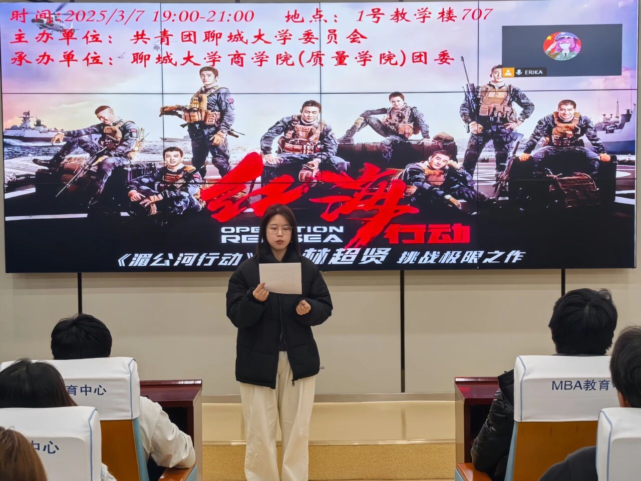影片播放前,刘聪睿紧扣电影“守护和平,展现中国力量”的主旋律,从2015年“也门撤侨”这一重大历史事件出发,深入剖析影片时代背景,巧妙融入爱国主义、团结协作等思想政治教育要点,鼓励同学们以影片中“蛟龙突击队”的平凡英雄为楷模,积极学习中国军人在祖国和人民需要之际挺身而出、英勇斗争的高尚品质,树立远大理想,为祖国繁荣发展贡献力量。