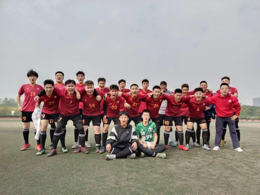 勇毅前行,团结奋斗。比赛开始前,队员们进行了充分的热身运动,并围成一个“同心圆”加油打气,宣示着必胜的决心。伴随着一声哨响,比赛激烈展开,踢球、传球、接球、抢球、顶球、射门……一系列动作行云流水般在球员们之间紧张而又猛烈地交替变换着。场外观众的心也被赛场上的一举一动所牵动,呐喊助威声与欢呼声连绵不断。在中场休息阶段,足球队队长带领队员根据情况调整战术规划,鼓舞士气。经历了一番精彩的角逐后,学院男子足球队以1:0的比分取得了比赛的胜利,比赛结束后双方队员互相击掌致谢。微风轻拂少年脸庞,秋阳照暖少年理想。