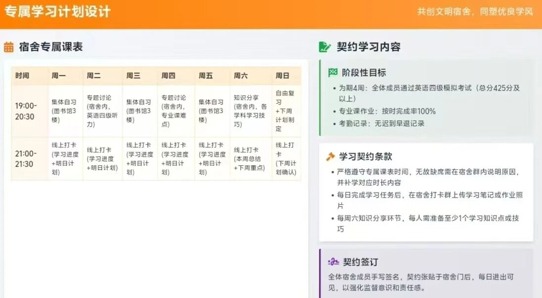 在活动实践中,各宿舍围绕“自主规划、互助共进、学风涵养”的目标,从制定“微计划”入手,通过多样形式推动舍风学风建设走深走实。一方面,各宿舍结合成员空闲时间制定“宿舍专属课表”,规划固定的集体自习、专题讨论或知识分享时段,让宿舍成为知识碰撞、思想交流的学习阵地;另一方面,“契约学习”模式则激发集体成长动力,成员共同商定阶段性目标、签订学习契约,在互助监督中完成约定,培养自律与合作精神。此外,不少宿舍还创新开展“宿舍的一天”打卡活动,通过这种具象化的打卡方式,清晰的展现了宿舍成员的学习规划与成长轨迹。