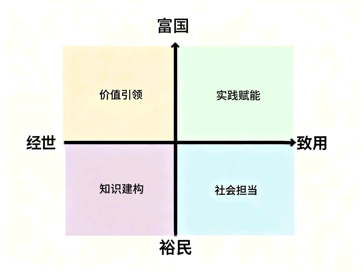 “四象限·1234N”以“家国价值”(富国-裕民)为纵轴,以“商学能力”(经世—致用)为横轴,构建“价值引领—知识建构—实践赋能—社会担当”的立体化坐标系。