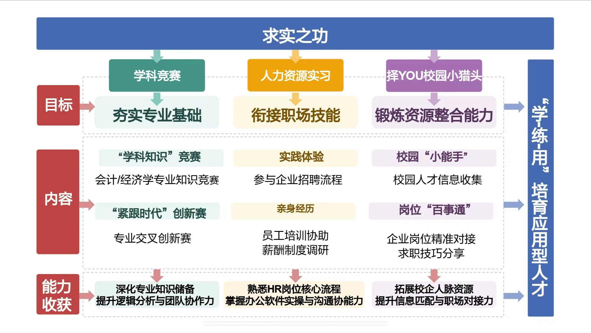 “致用”,即“求实之功”,以“实践运用”为径,聚焦深化学以致用、推动以用促学、衔接课堂实践。学院紧密对接国家人才战略需求,以“学-练-用”贯通融合的理念重塑实践教学体系,推动知识从课本走向实践,能力在现实中扎根生长。我们通过构建以学科竞赛、实习实训、就业赋能为三大支柱的“致用”育人体系,有效实现了“在学中做,在做中学”的良性循环,切实提升学生的实践能力与职业素养。
