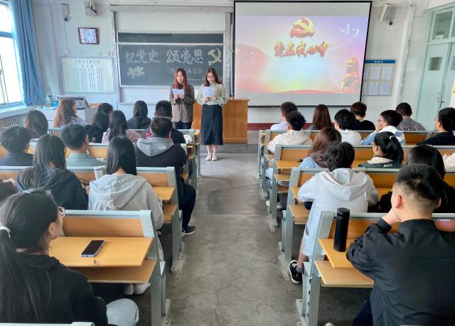 活动伊始,主持人进行简短致辞,宣读开场白,并简单介绍了近年来党的丰功伟绩,朗诵比赛也随之拉开帷幕。《祖国赞》朗出国之雄威,《党旗颂》诵出党之伟大。《以史为鉴,可以知兴替》带领同学们追忆党史,回顾那段峥嵘岁月,缅怀为中国革命建设献身的前辈们,帮助同学们了解中华民族的革命历史和自强不息的伟大民族精神。在每段朗诵结束之后,主持人都会随机邀请一名同学做出点评,以此来加深同学们对于每段朗诵的认知与感触。在同学们对峥嵘党史形成初步的概念与认知后开始进行党史影片播放。在影片播放过程中,同学们认真观看,在重要节点部分主持人会对其进行更深入的讲解,以此来丰富同学们对党史的认识,学习前辈们大无畏精神和正义的品质。