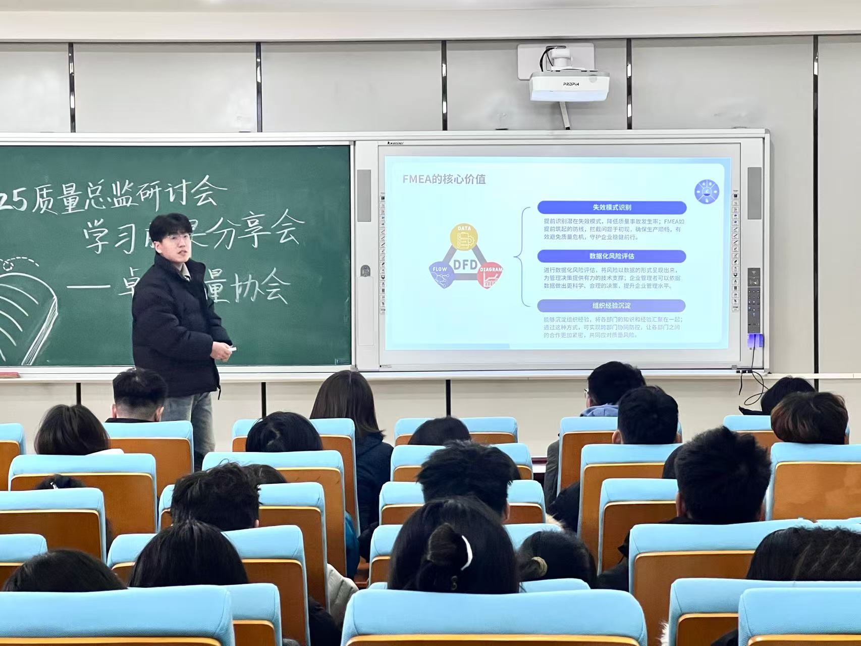 分享嘉宾结合自身参会经历与实践案例,围绕质量行业发展趋势、企业质量管理实践、数字化与智能化转型等议题,向在场同学生动传达了研讨会的前沿观点与岗位发展路径,帮助同学们对质量管理的专业价值与职业前景形成了更为清晰的认识。