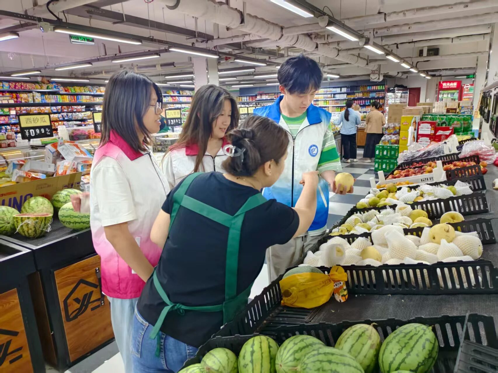 实践队首站走访当地生鲜超市,与工作人员深入交流,围绕果蔬采购渠道、消费者偏好等核心问题展开调研,精准把握市场对优质农产品的需求,清晰认知终端市场对大棚种植产品在品质稳定性、持续供应能力等方面的具体要求。随后,团队深入葡萄种植大棚等生产一线,与农户面对面沟通,细致观察作物生长环境,重点了解大棚温控、智能灌溉、绿色病虫害防治等关键技术的实际应用。通过实地查看大棚结构、自动遮阳网、滴灌系统等设备运行,对比传统与科技化种植模式,队员们亲身感受到智能技术带来的生产变革,进一步思考科技如何破解农业生产瓶颈,驱动产业现代化转型。