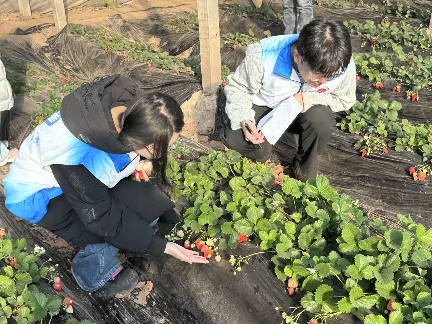 在负责人的引导下,实践队走进标准化种植大棚,棚内温度与湿度调控适宜,翠绿的藤蔓沿着支架整齐攀爬,一颗颗饱满的草莓藏匿在绿叶间,色泽鲜亮、果香浓郁。队员们一边俯身察看不同品种草莓的生长状态,一边向负责人请教各类品种的生长周期、挂果率、口感特点及市场定价,并拍摄记录草莓的形态细节与生长环境。针对草莓的保鲜技术、采摘标准、产量波动等关键问题,队员们与负责人展开细致交流,全面摸清了产品的核心特质与市场竞争力。