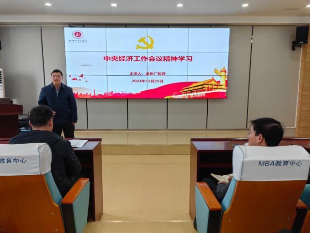 梁树广带领全体教职工集体学习中央经济工作会议精神,认为中央经济工作会议是在以进一步全面深化改革推进中国式现代化关键时刻召开的一次十分重要的会议。习近平总书记的重要讲话全面总结2024年经济工作,科学分析当前经济形势,对做好2025年经济工作进行了系统部署,为做好明年和今后一个时期经济工作指明了前进方向、提供了根本遵循。梁树广结合当前的经济形势,指出国内经济运行在需求、供给、就业、风险四方面仍面临“不少”困难挑战,但是我们要坚持“五个统筹好”的工作原则,正视困难、坚定信心,努力把各方面积极因素转化为发展实绩。会议从经济增长、就业与物价、国际收支与居民收入四个维度明确了2025年经济工作的目标,进而提出“更加积极有为”的宏观政策,财政政策基调由“积极”升级为“更加积极”,货币政策基调由“稳健”升级为“适度宽松”。接着,梁树广就“九大任务”重点工作进行了详细阐释,并分享了任泽平年度演讲“2025中国经济十大预测”。最后,呼吁老师们结合经济问题、国家政策和个人研究基础,做好科研选题。