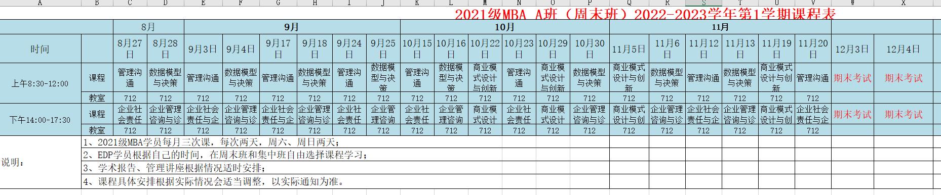 2021级MBA A班(周末班)2022-2023学年第1学期课程表