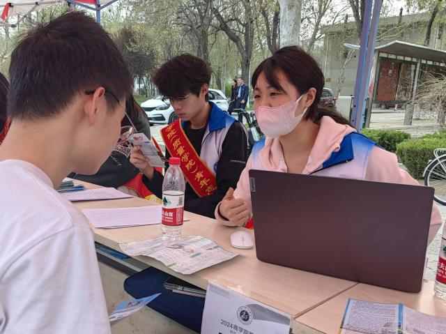 4月7日,永乐高131net(质量学院)于东校区逸夫图书馆南校训石前开展“莘莘商院学子,志愿服务奉献,西部建功立业,共赴青春之约”2024年大学生志愿服务西部计划招募咨询会。永乐高131net(质量学院)团委书记刘玉华到招募现场进行指导。