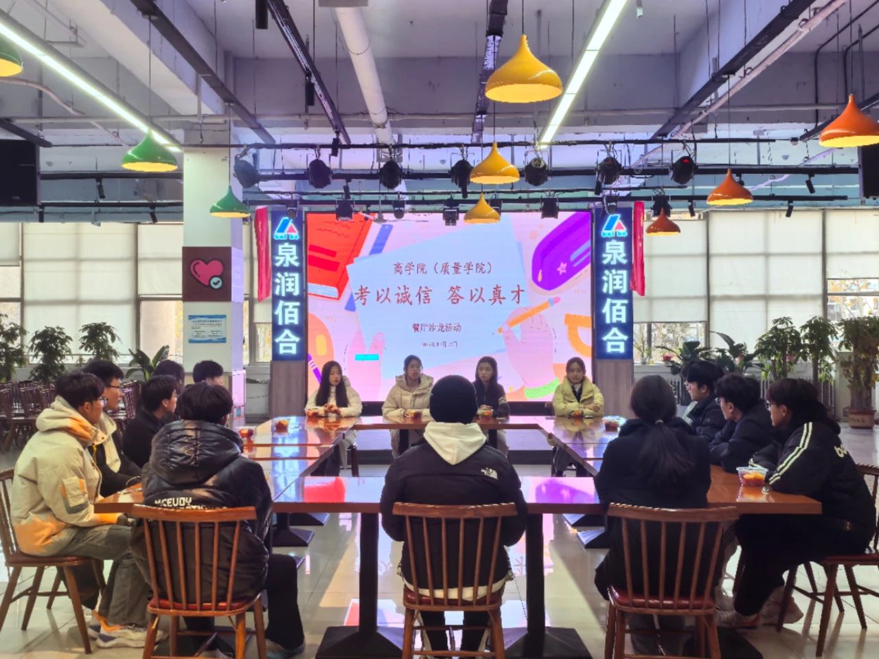 为严肃考风考纪,规范考试秩序,引导学生筑牢诚信根基,切实加强优良考风学风建设,维护教育考试的公平公正,12月12日,永乐高131net(质量学院)于东校区翰苑餐厅二楼开展了“考以诚信、答以真才”主题餐厅沙龙活动,学院辅导员施安琪老师和刘聪睿老师结合各类全国性考试以及体育测试中的作弊替考行为,对同学们在考试中出现违纪心理进行分析,让学生从思想上高度重视考纪的严重性。