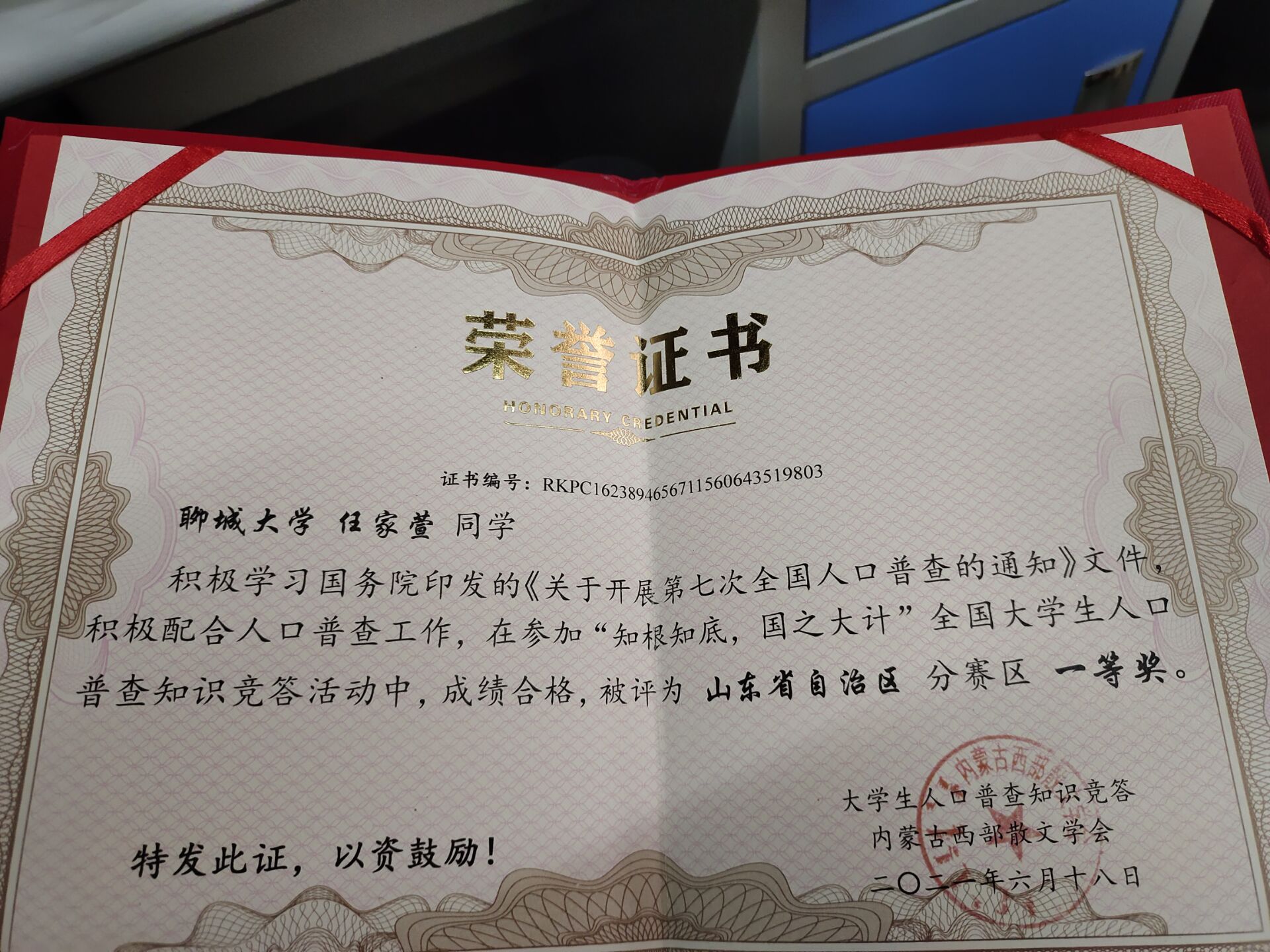 任家萱于2021年6月18日荣获“知根知底,国之大计”全国大学生人口普查知识竞答山东省自治区分赛一等奖