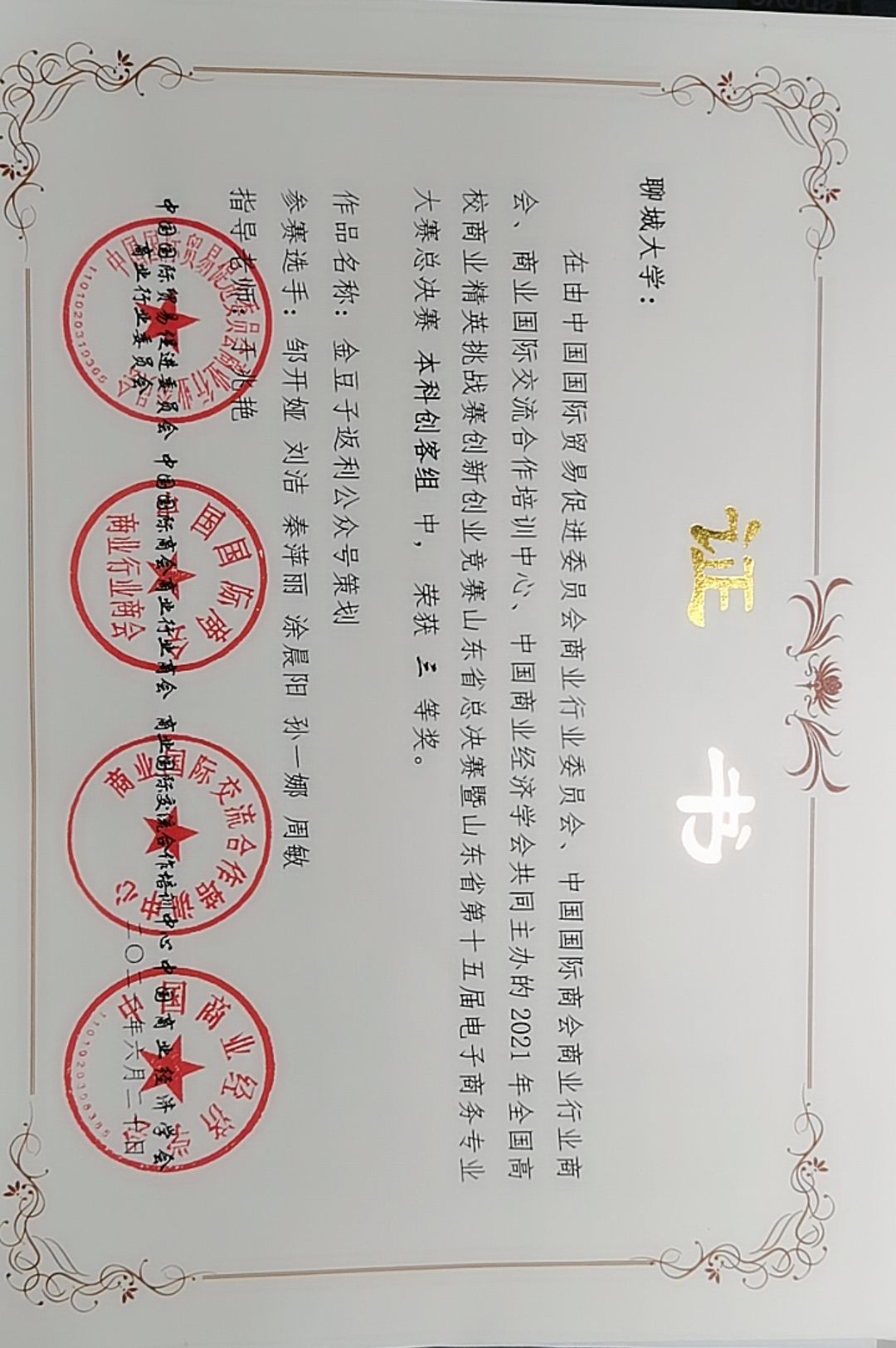 秦丽萍于2021年6月20日荣获2021年全国高校商业精英挑战赛创新创业竞赛山东省总决赛暨山东省第十五届电子商务专业大赛总决赛本科创客组三等奖