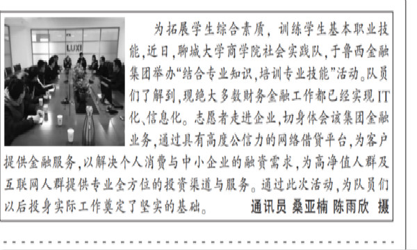 为拓展学生综合素质,训练学生基本职业技能,近日,永乐高131永乐高131net社会实践队,于鲁西金融集团举办“结合专业知识,培训专业技能”活动。志愿者了解到,现绝大多数财务金融工作都已经IT化、信息化。志愿者走进企业,切身体会该集团金融业务,通过具有高度公信力的网络借贷平台,为客户提供金融服务,以解决个人消费与中小企业的融资需求,为高净值人群及互联网人群提供专业全方位的投资渠道与服务。通过此次活动,为队员们以后投身实际工作奠定了坚实的基础。