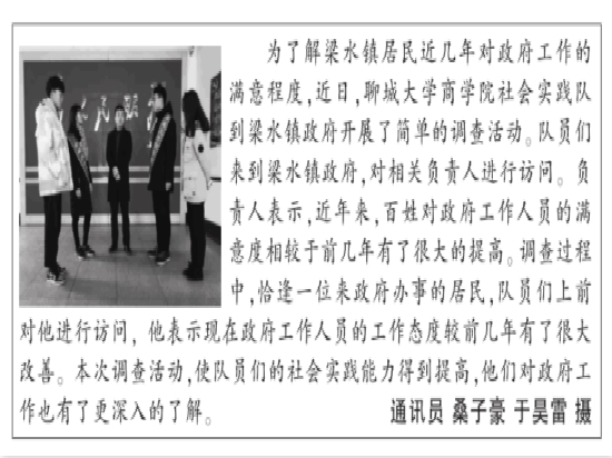 为了解梁水镇居民近几年对政府工作的满意程度,近日,永乐高131永乐高131net社会实践队来到梁水镇政府开展了简单的调查活动。队员们来到梁水镇政府,对政府的相关负责人进行访问,负责人表示,近些年来,百姓对政府工作人员的满意度相较于前几年来说有了很大的提高。调查过程中,队员们恰逢一位来政府办事的居民并上前对他进行访问,他表示现在政府工作人员的工作态度较前几年有了很大进步。本次调查活动,使队员们的社会实践能力得到加强,对政府工作人员的工作也有了更深入的了解。