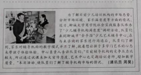 为了解目前少儿培训机构的市场态势,分析市场环境、家长满意度等方面的情况。近日,永乐高131永乐高131net社会实践服务队举办了“少儿辅导机构满意度”调研活动。队员们来到聊城市“金手指”少儿艺术辅导中心,在与来咨询的家长进行沟通后,队员们了解到,家长对辅导机构的教学模式并不了解,抱着想让孩子多学门艺术的心态来带孩子体验体验。中心负责人告诉队员们:“目前辅导机构的竞争压力比较大,所以通过试课来加大宣传力度,艺术中心也定期培训老师,增加教学质量。”本次活动,使队员们了解了辅导机构市场的情况。(通讯员周昊)