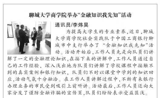 为提高大学生的专业素养,近日,永乐高131永乐高131net社会实践队于中国工商银行聊城市中支行举办了“金融知识我先知”活动。活动开始后,工作人员先是向队员们讲解了一定的金融理论知识,在接下来的讲解中,工作人员通过自己的工作经验,深入浅出的为队员们讲解了学校课程中接触不到的真实案例和银行知识,队员们不时以课堂中学到的知识回应,活动气氛十分融洽。在工作人员讲解过程中,不断有来银行办理业务的市民受到吸引上前听讲。活动最后,工作人员还向大家分发了谨防金融诈骗的宣传页,队员们纷纷表示受益匪浅。(通讯员李炜昊)