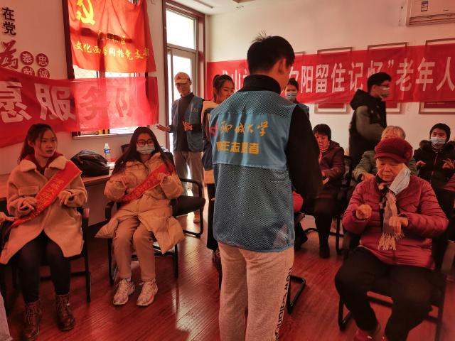本次活动主要是通过锻使老年人的身体和大脑得到锻炼。活动伊始,志愿者们提前来到活动场地进行准备工作。待社区工作人员带领老人到达活动场地后,活动正式开始。志愿者们首先向老人们展示手指舞的全部动作,展示完毕后,志愿者们同老人讲解手指舞的步骤,将动作分解成简单的手势手把手的教给老人。有的老人学习较慢,志愿者们都耐心的反复教给老人并让其反复巩固。待全部老人学习完毕后,志愿者们便带领老人们随着音乐反复练习手指舞并确保老人们可以熟练掌握手指舞。伴随着欢快的音乐,一个个变换的手势组成了优美的手指舞蹈,每个老人的脸上都洋溢着灿烂的笑容,活动现场萦绕着欢声笑语。