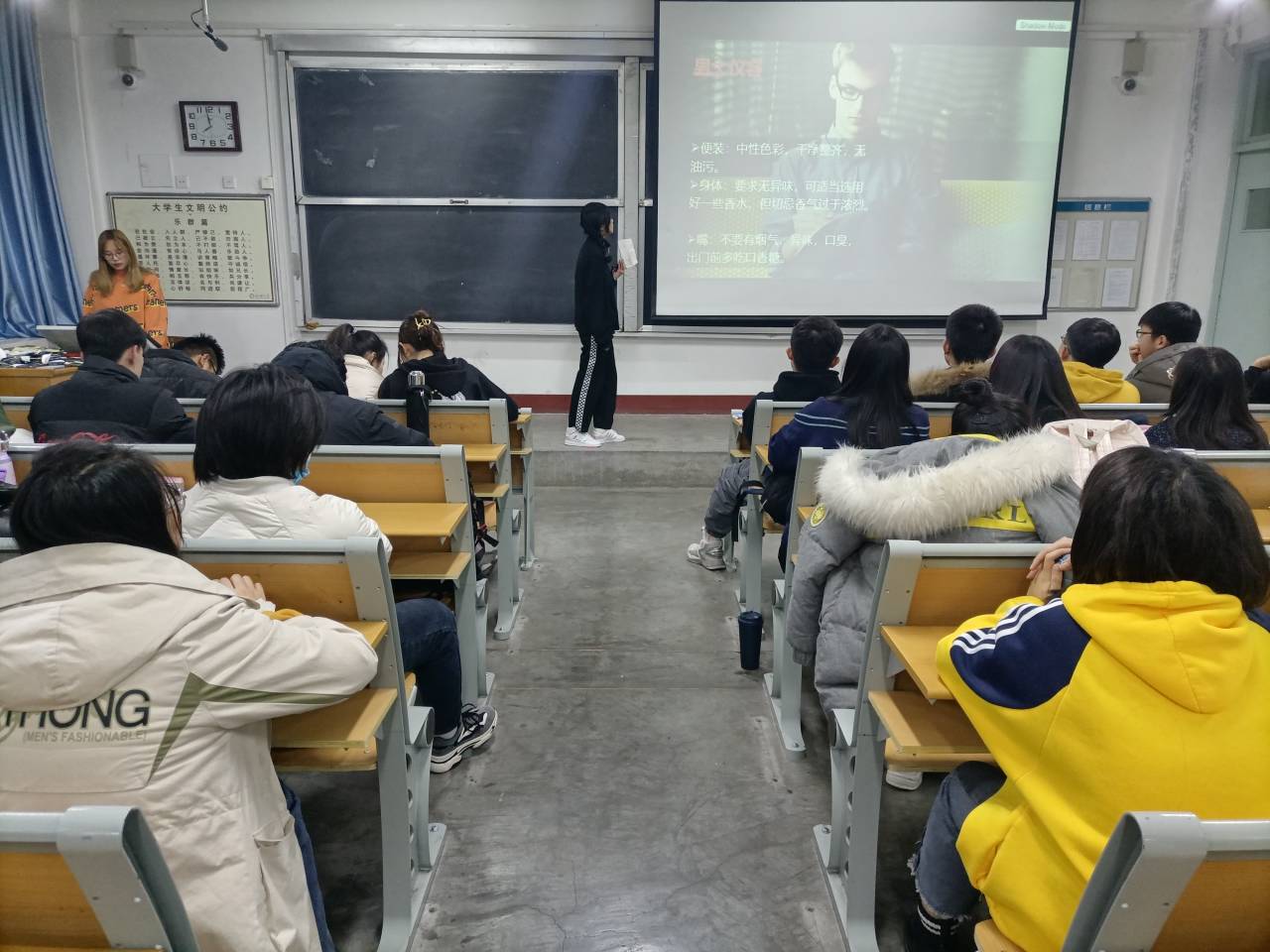 此次礼仪宣讲活动主要分为播放礼仪视频和介绍礼仪知识两个环节。负责人在介绍此次活动的背景和意义后,播放了礼仪重要性的小视频,调节现场气氛,带动同学们学习的积极性。活动中,宣讲人细致到位地讲解了商务礼仪仪表服饰、交谈礼仪、握手礼仪、电话礼仪、乘车礼仪等方面的知识,引导学生们认识不同情景下该如何做到礼貌得体。同时,宣讲人配合宣讲进行了生动形象的现场同步示范,其中包括电话接听场景、握手注视等内容,从不同的角度展示了商务礼仪的基本规范和要求,引导同学们掌握礼仪知识。其中宣讲人还与学生们展开互动,加深了同学们对宣讲内容的理解,专业的讲解博得一致好评。