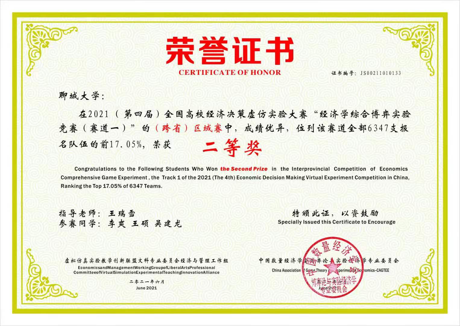 2021年6月,张雨欣在第三届“新道杯”全国高等院校“数字营销·新零售”技能大赛中获得山东省赛三等奖,王硕在2021(第四届)年全国高校经济决策虚仿实验大赛“经济学综合博弈实验竞赛(赛道一)”的(跨省)区域赛中获得二等奖,张玉洁在2021(第四届)年全国高校经济决策虚仿实验大赛“经济学综合博弈实验竞赛(赛道一)”的(跨省)区域赛中获得一等奖,郑安娜在2021年全国高校商业精英挑战赛物流与供应链竞赛全国总决赛中荣获二等奖。特此,对以上获奖同学予以祝贺表彰。