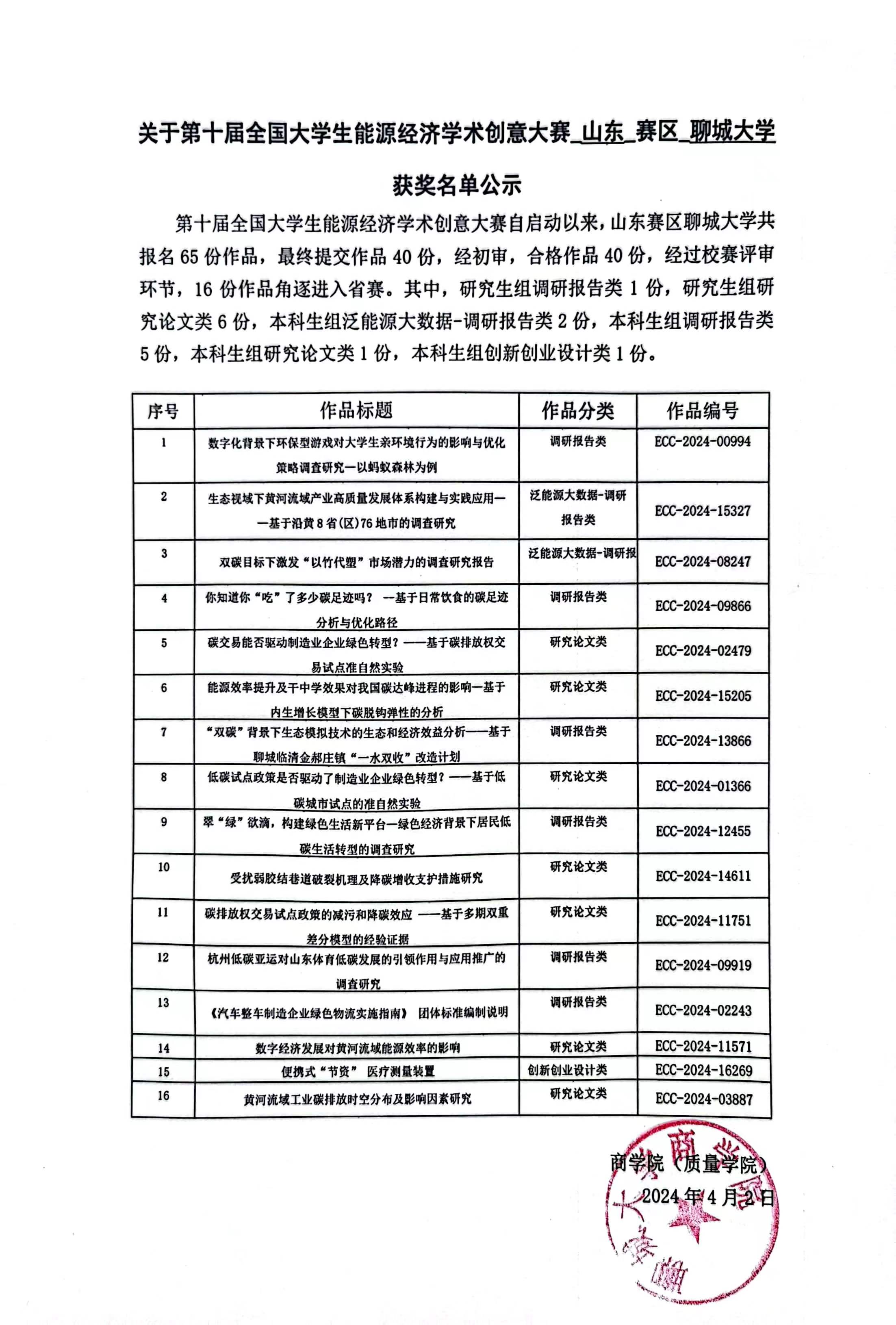 关于第十届全国大学生能源经济学术创意大赛山东赛区 永乐高131 获奖名单公示