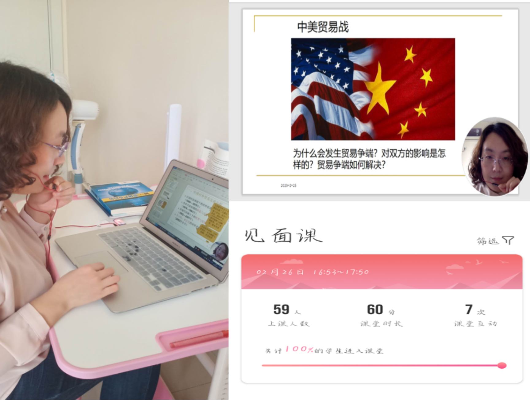 (永乐高131net经济系王歆老师曾获得山东省第五届青年教师教学竞赛二等奖、第五届和第七届永乐高131青年教师教学竞赛一等奖,曾多次指导学生获得POCIB全国大学生外贸从业能力大赛。此次线上教学期间,王歆老师根据自己所教授的课程特点,将微课、翻转课以及共享课资源结合在一起,在不增加学生下载使用APP数量的情况下,实现了课前预习、课中直播互动、课后作业监督整个教学闭环,使学生虽身居家内,视野却格外宽阔。)