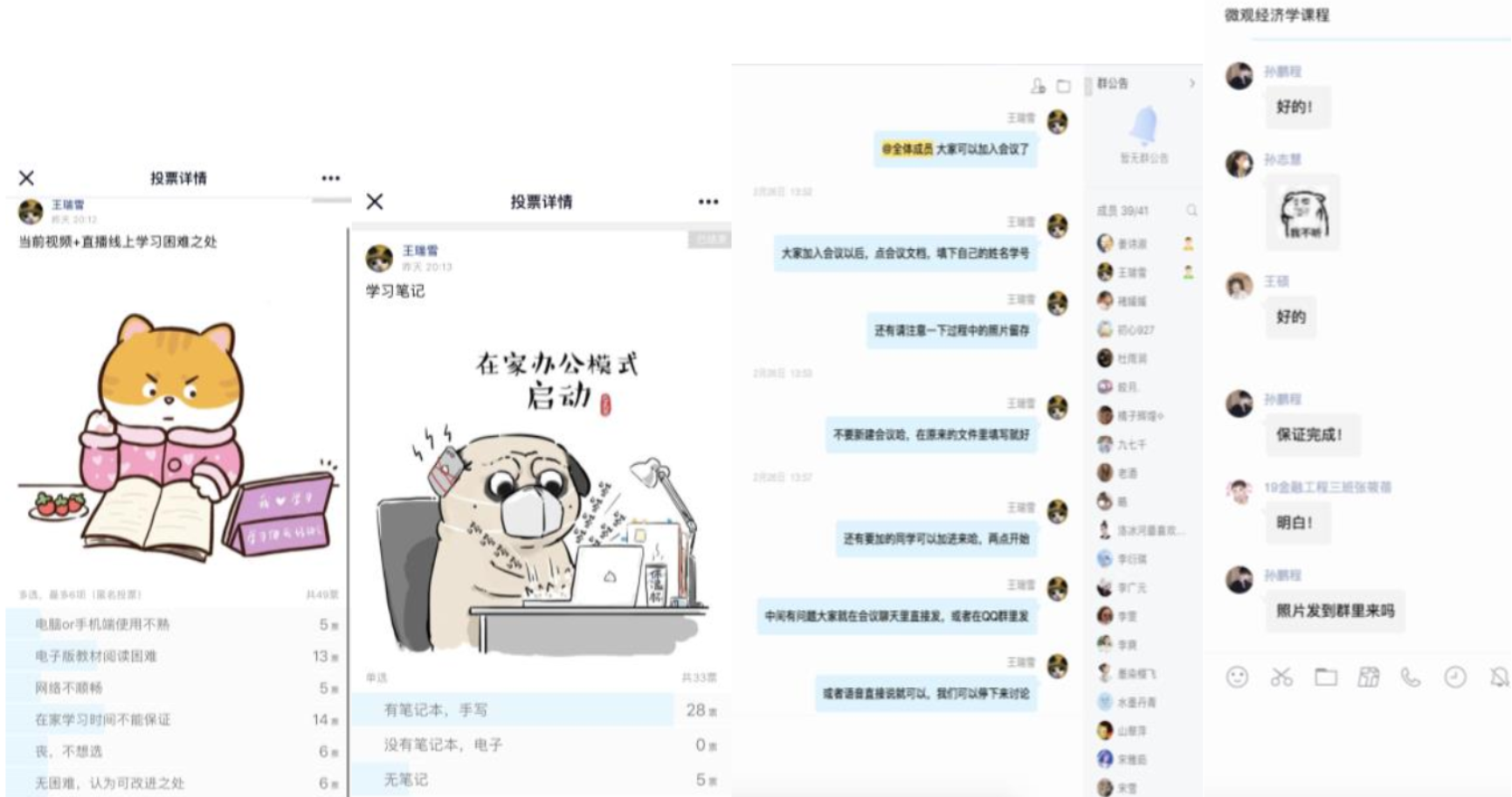 3.4种互动:师生互动、生生互动、人机互动、资源互动。疫情期间虽然同一班级的学生身在各处,但通过这一方屏幕,都能感受课堂的热烈、吸取知识的喜悦。疫情没有真正将老师与学生阻隔开,网络将我们联系得更加紧密。从线下到线上,教学的步伐不曾停驻;从纸笔到屏幕,学习的热忱不曾改变。从学院到小家,师长的关心不曾断联。