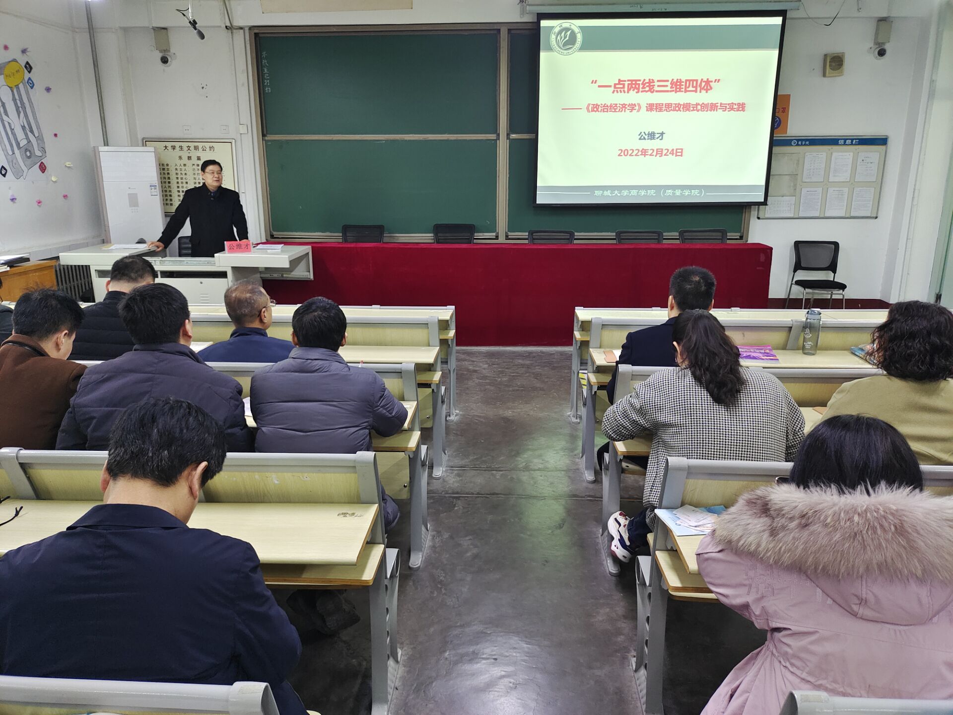 课程思政是高校积极落实习近平总书记指示精神的实践探索,加强对课程思政内涵的理解,探寻课程思政有效实施的机制构建,对推进课程思政在教学中“落地”有着重要意义。公维才为学院师生上的思政课正是推动课程思政“落地”的重要一课,又恰逢山东省高校首届课程思政教学比赛即将开始之际,此次思政课不仅让全院教师认识到课程思政建设的必要性和迫切性,更增强了教师融入课程思政教学的信心,激发了教师参加课程思政比赛、提升课程育人能力的热情。