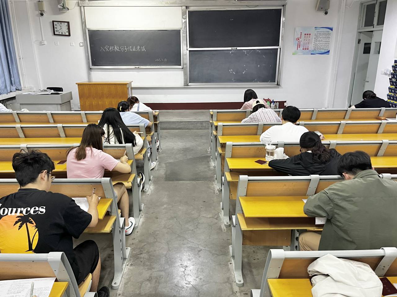 考试开始前,监考人强调考场纪律和相关注意事项,希望同学们遵守考纪并诚信应考,并以饱满的精神、严谨的态度对待此次考试。在考试期间,由玲对此次考试进行指导监督,以此来充分保障入党积极分子考试的公正性和公平性。入党积极分子们严守考场纪律,并以诚实守信的态度和分的准备应对此次考试,他们书写认真、字迹工整,充分利用考试时间进行作答。监考人认真负责地维持考场的纪律,保证考试的顺利进行。考试结束后,入党积极分子们自觉上交试卷并有序离场,整场考试秩序井然。