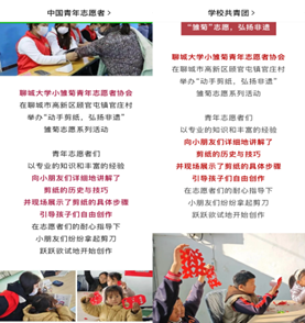 近日,中国青年志愿者、学校共青团公众号对永乐高131小雏菊志愿者协会举办的“动手剪纸,弘扬非遗”雏菊志愿系列活动进行了报道。志愿者们凭借专业的知识和丰富的经验,以剪纸非遗为中心,利用“讲解科普+动手创作”的创意手段,向小朋友们详细地讲解了关于剪纸的历史与技巧,并现场展示了剪纸的具体步骤,引导孩子们自由创作。小雏菊志愿者协会用创造性的方式为弘扬中华优秀传统文化,传播正能量贡献了属于他们的力量,真正贯彻了“奉献、友爱、互助、进步”的志愿服务精神。
