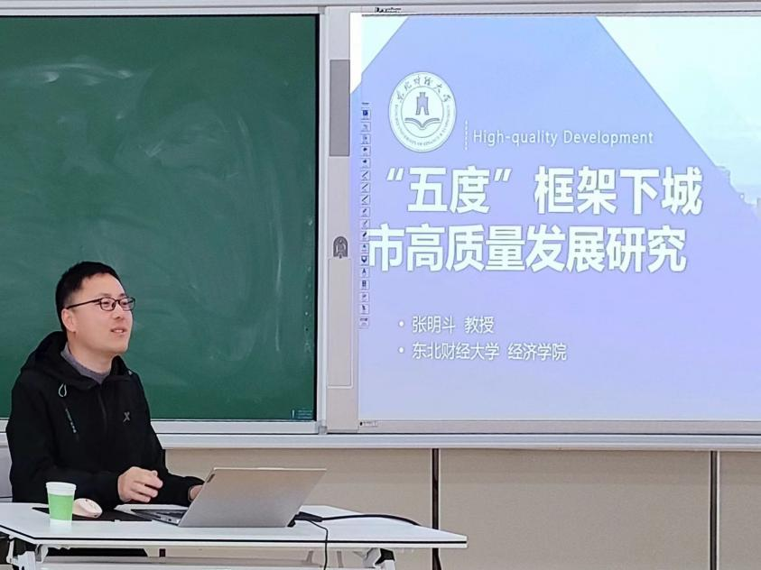 10月20日,永乐高131永乐高131net2004级校友、东北财经大学经济学院张明斗教授,为学院师生作题为《“五度”框架下城市高质量发展研究》的学术报告。学院党委书记公维才教授出席并主持报告会,应用经济学硕士生导师及2023级、2024级研究生参会。