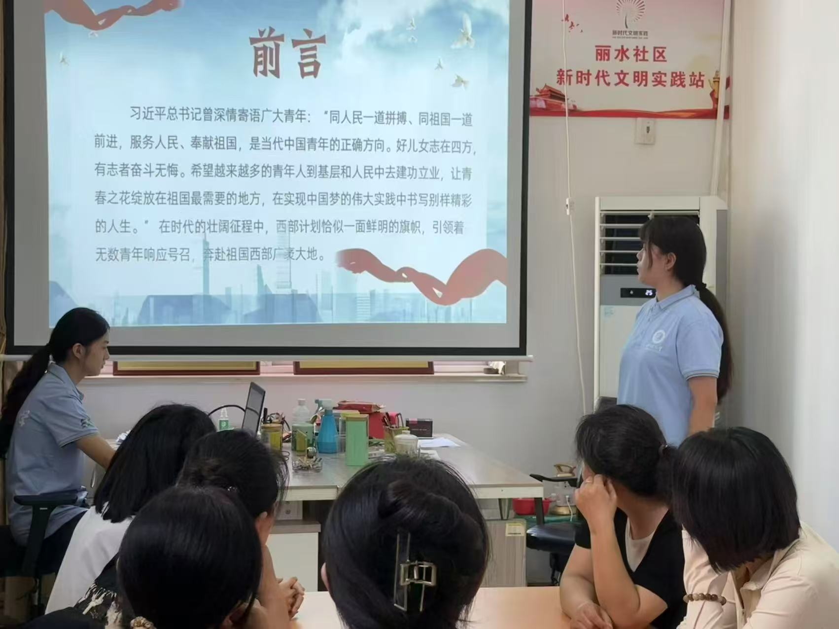 6月30日,实践队员前往丽水社区,探索西部计划精神在基层的传播潜力。队员们在与社区工作人员及居民了解社区基本状况的同时,并积极传播西部计划的志愿精神。调查发现,丽水社区居民对西部计划志愿精神普遍怀有赞赏与支持的态度,但对于其具体内涵和实践途径却知之甚少,即社区层面的志愿精神传播潜力巨大。为此,队员们积极规划组织社区志愿服务活动,开展西部计划精神宣讲活动,致力于让志愿精神在社区的每一处落地生根。