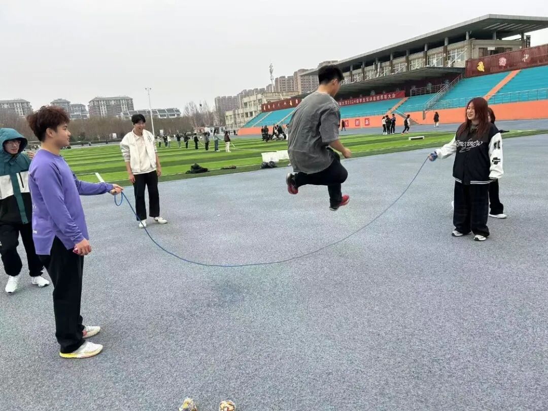 跳大绳环节,同学们纷纷展现出卓越的运动天赋,摇绳者匀速有力,跳绳者身轻如燕、活力四射,以快速的节奏、轻盈的步伐跳出了青春的活力与精彩。大家在游戏中相互鼓励、相互帮助,无形之中增进了彼此的友谊,现场一片其乐融融。
